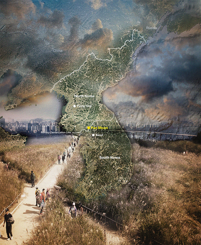 The embodiment of next-generation transportation projects a city without roads and cars. The streams of hyper-loops hover over the green sea but go underground below the urban nucleus because the ground surface is preserved for walking.
