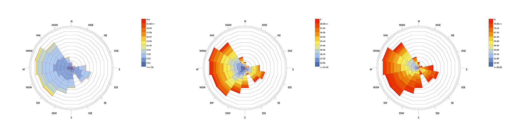 Wind direction and maximum velocity measured in the Boston area are analyzed to inform the following design proposal. That is, wind data from the Boston area are used as a copy of local conditions surrounding the Gropius House. In the simulation, the wind comes from a WSW direction at a velocity of 12.5m/s. After setting parameters for viable air speed, dry bulb temperature, and relative humidity, we were able to conclude that the wind conditions are appropriate for natural ventilation 2096 hours per year (23.93%).